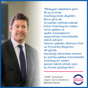 Mr. Edward Strachan, Regional Director of 'Caspian Event Management' mentioned at the press conference dedicated to the opening of the 14th Azerbaijan International Agriculture Exhibition Caspian Agro and the 26th Azerbaijan International Food Industry Exhibition : “For certain reasons, I was outside Azerbaijan for about 18 months. Therefore, taking this opportunity, I would like to congratulate the entire Azerbaijani people on the historic victory and return of their ancestral lands! I sincerely wish your country prosperity and well-being! I was waiting for this opportunity to personally congratulate the Azerbaijani people on this brilliant victory of the 44-day Karabakh war!”.